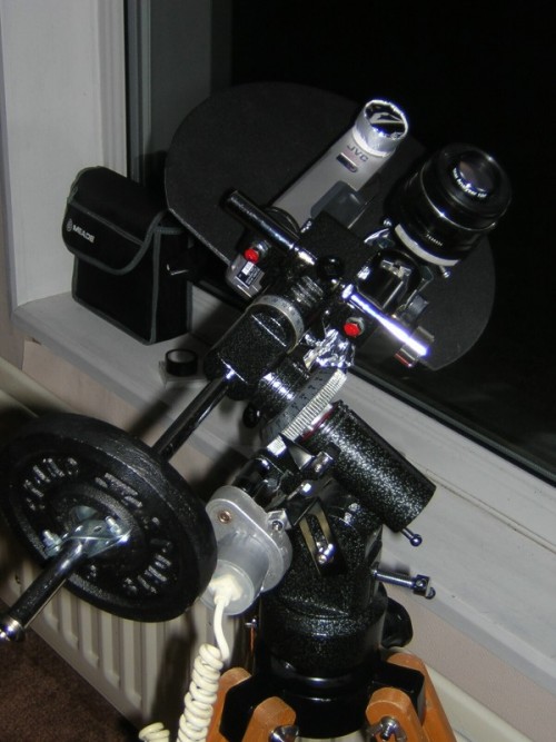 JVC DV3 digital video camera with Baader solar filter for general recording of eclipse. Note the Pizza base sun shield needed as the viewfinder is in line with the lens. The camera was set to maximum optical zoom and the focus set manually to infinity. the auto exposure was set to maximum under exposure to counteract the tendency for the auto exposure to overexpose the bright solar image. White balance left on auto. Toucam webcam with 29mm SLR lens and Star Analyser 100 diffraction grating to record the spectra, screwed into a hole cut in a lens cap. The combination gave a dispersion of 18.33 A/pixel. The direction of the moon's path was estimated beforehand and the camera angled so the path was diagonally across the field of view. This meant that the spectrum could be orientated diagonally across the field at 90 deg to the path, giving maximum length of spectrum and minimum effective width of the sun's image close to totality. Note the webcam is wrapped in aluminised plastic film to keep the sunlight out of the camera (The grey plastic case of the camera is translucent) A solar filter of a black polymer material (not shown) was used in front of the diffaction grating before and after totality as the Baader solar film produces severe fringing in the spectrum due to interference effects between the two coated sides. Eq1 mount with battery driven RA motor drive was used to track the sun. The Dec axis was rotated 90 deg to allow the mount to track past the meridian during the eclipse. The unit tracked perfectly following a rough polar alignment, needing just an occasional declination adjustment during the eclipse. This picture was taken before the equipment was dismantled for the flight to Turkey. The counterbalance weight, tripod and tools were placed in the hold while the rest of the equipment including laptop, chargers etc was carried on as hand baggage. The photo was used to make sure everything was reassembled correctly on arrival. |