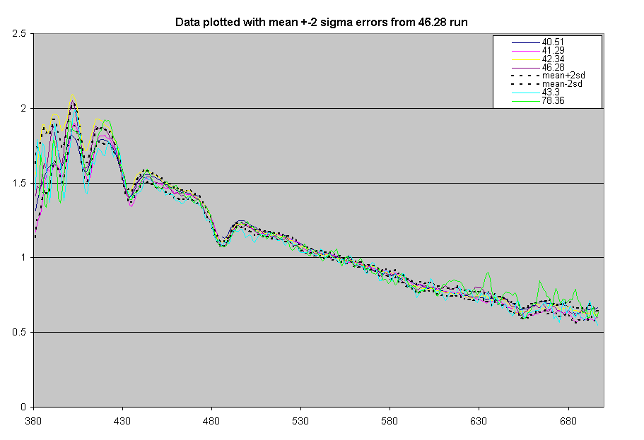 The graph below shows the spectra with +-2sigma lines based on the repeat observations from 6th Nov. Each observation will have its own errors depending on the brightness of the target and conditions on the night but the variation between spectra with wavelength follows the 6th Nov error so differences between the spectra are probably not significant.